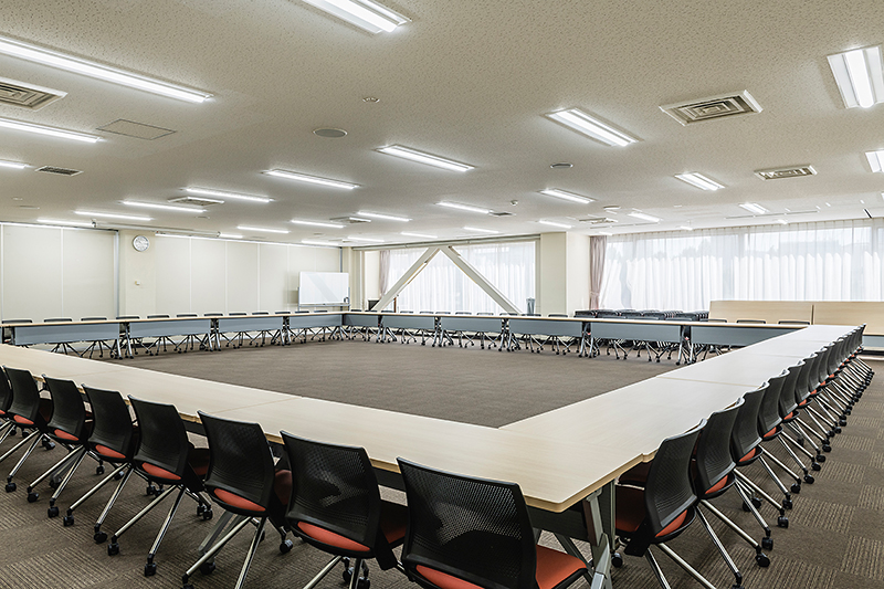 大きな窓(換気可能な窓が2ヶ所)が特徴の会議室です。1室で約100名、隣接する6-65・67会議室の3室通しでは約200名のセミナー・講演会の開催が可能です。テーブル配置を島型にすることで商談会にもお使いいただけます。有線LAN・Wi-Fiの利用が可能であり、リアル/オンラインのハイブリット型イベントの開催も可能です。