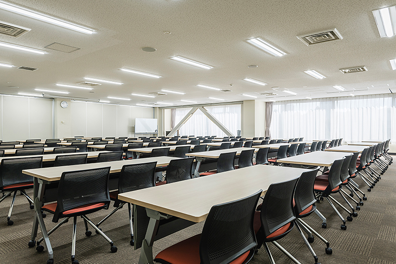 大きな窓(換気可能な窓が2ヶ所)が特徴の会議室です。1室で約100名、隣接する6-65・67会議室の3室通しでは約200名のセミナー・講演会の開催が可能です。テーブル配置を島型にすることで商談会にもお使いいただけます。有線LAN・Wi-Fiの利用が可能であり、リアル/オンラインのハイブリット型イベントの開催も可能です。