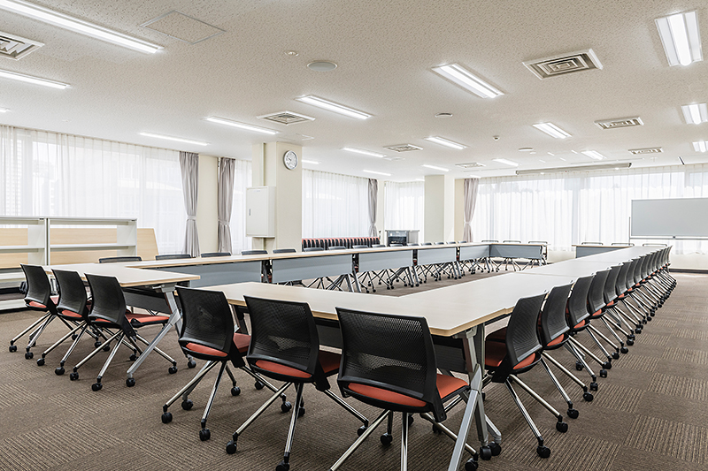 角部屋のため窓が2面(換気可能な窓が6ヶ所)にある明るい雰囲気の会議室です。60名程度の中規模なセミナー・講習会や40名程度の会議に最適です。有線LAN・Wi-Fiの利用が可能であり、リアル/オンラインのハイブリット型イベントの開催も可能です。